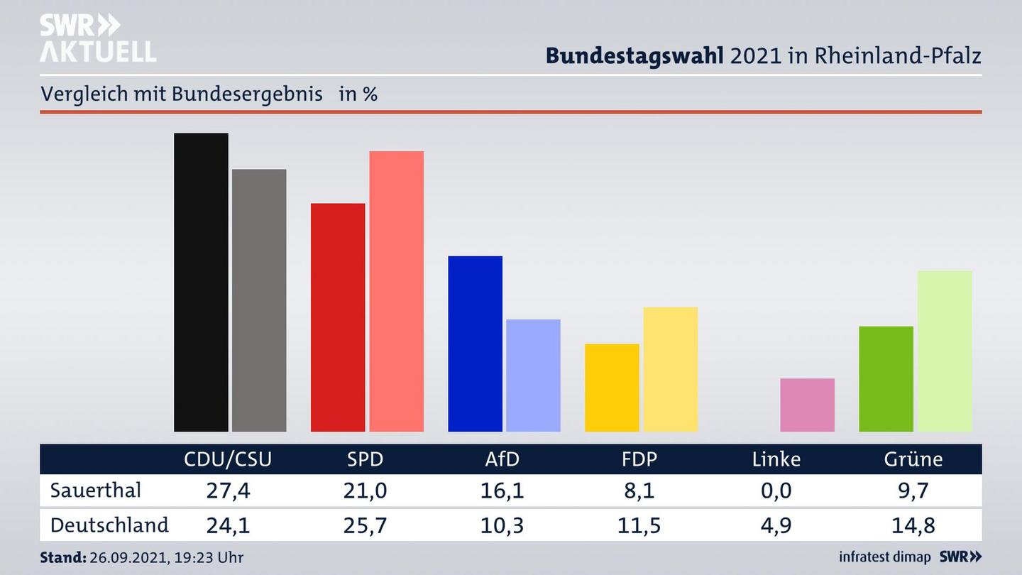 In Orten, die zu einer Verbandsgemeinde gehören, wird das Wahlergebnis in der Regel ohne Briefwähler angezeigt. Die Briefwahl wird zumeist zentral bei der Verbandsgemeinde ausgezählt und kann daher dann nicht separat für die einzelnen Gemeinden ermittelt werden. Möglicherweise enthält dieses Gemeindeergebnis auch Stimmen aus Nachbargemeinden, wenn dort weniger als 50 Wähler ihre Stimme im Wahllokal abgegeben haben.